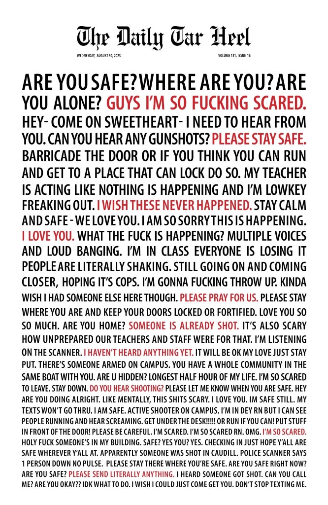 Late last month when a shooting at the UNC campus resulted in the death of a faculty member and sent scores of students into hiding, the Daily Tar Heel used the visual impact of multiple text messages to deliver the message that things are not normal in a world where shootings occur on a regular basis.